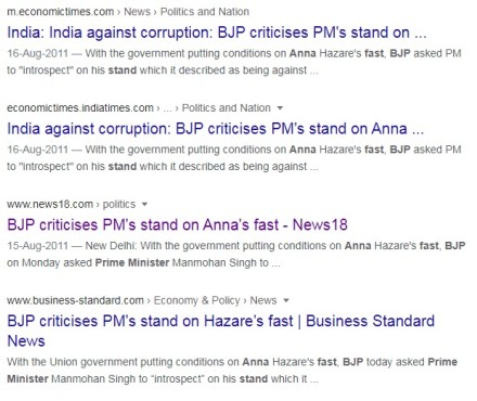 Then PM Manmohan Singh had criticised the anti-corruption movement led by Anna Hazare, who had said that he would go on fast from Aug. 16, 2011 against corruption. Then PM Manmohan Singh had said that there was no magic wand to end corruption and that hunger strikes are not a means to achieve the objective. BJP’s criticism had been widely reported as seen below: