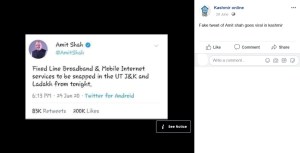 A screenshot of a viral tweet allegedly by Home Minister Amit Shah is doing rounds on social media platforms. The viral tweet dated June 29, 2020, with a timestamp of 6:13 PM says “Fixed Line Broadband & Mobile Internet services to be snapped in the UT J&K and Ladakh from tonight.”