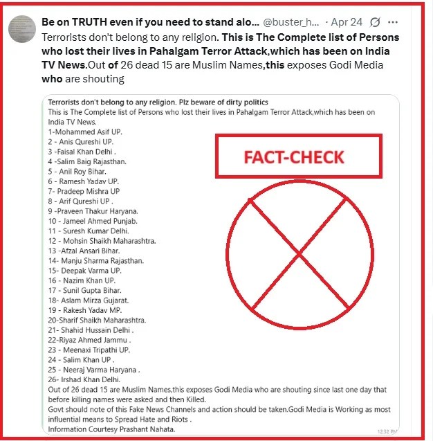 Terrorists don’t belong to any religion. This is The Complete list of Persons who lost their lives in Pahalgam Terror Attack,which has been on India TV News.Out of 26 dead 15 are Muslim Names,this exposes Godi Media who are shouting https://t.co/APC2OEd1eP pic.twitter.com/sakfc3iB68