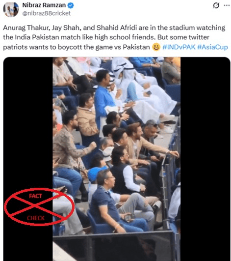 Claim: Footage shows Anurag Thakur, Shahid Afridi and Jay Shah were seen sitting during India Vs Pakistan Asia Cup cricket match on September 14, 2025.