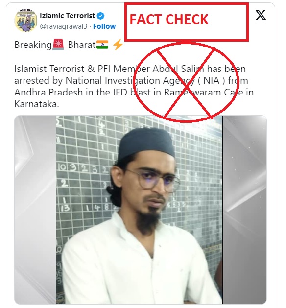 The claim reads:”Islamist Terrorist & PFI Member Abdul Salim has been arrested by National Investigation Agency ( NIA ) from Andhra Pradesh in the IED blast in Rameswaram Cafe in Karnataka.”