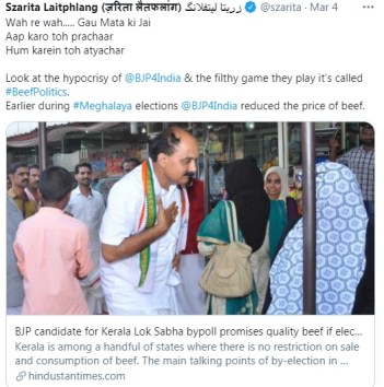 A Twitter user Sajjad Ahmad Khan, shared the video with a caption, “BJP is full of Hypocrisy…BJP Leader in KERALA announced to provide best BEEF to his Voters. BJP kisi ki sagi nhi@sagufa_momtaz @IamJavedAshraf#लाल_टोपी_वाला_गुंडा #ReleaseRanjitSingh”