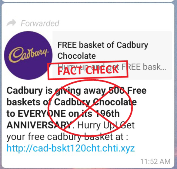 DigitEye India found a similar clickbait site which claimed to be an offer from the global chocolate maker Cadbury giving away 500 baskets of their chocolates to ‘EVERYONE’ on their 196th anniversary. The claim said, “Cadbury is giving away 500 Free baskets of Cadbury Chocolate to EVERYONE on its 196th ANNIVERSARY. Hurry Up! Get your free cadbury basket at : http://cad-bskt120cht.chti.xyz”