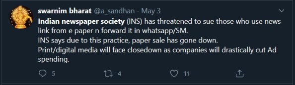 The Indian Newspaper Society (INS), which is an apex body of the print media, issued an advisory to its members on April 30, 2020. According to a report by Newslaundry, the body said “A lot of newspapers are available in the epaper format online in the morning every day, some of them being paid and some being free. Many users are actually copying the newspaper and creating PDFs which they circulate in Whatsapp and Telegram groups to the readers, leading to a loss in both subscription revenue for the print newspapers as well as epapers digitally”.