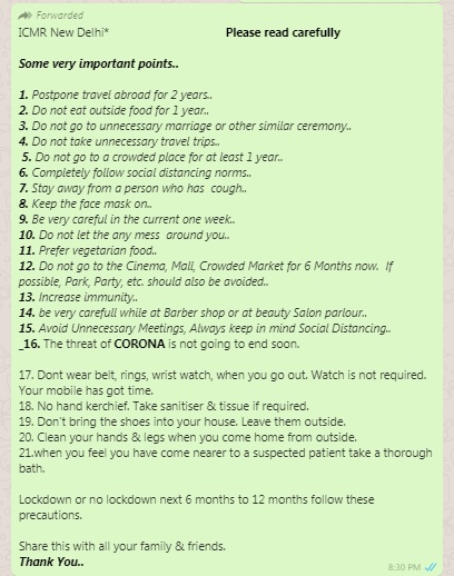In view of the current lockdown ending on May 17, this message has gone viral claiming ICMR in the beginning as authentic source. This message is also doing rounds on social media.