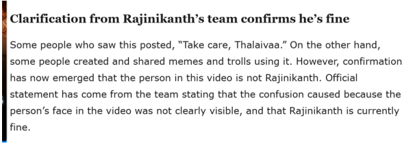 A Times of India report and MSN report later mentioned an official clarification by Rajnikanth’s PR team on the issue. The reports said that an official “statement has come from the team stating that the confusion caused because the person’s face in the video was not clearly visible, and that Rajinikanth is currently fine.”