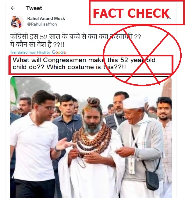 The accompanying message claimed that Rahul Gandhi sported Baba look as part of his his Yatra in Rajasthan showing Congress leader Sachin Pilot on his right and Congress general secretary Digvijay Singh on his left.