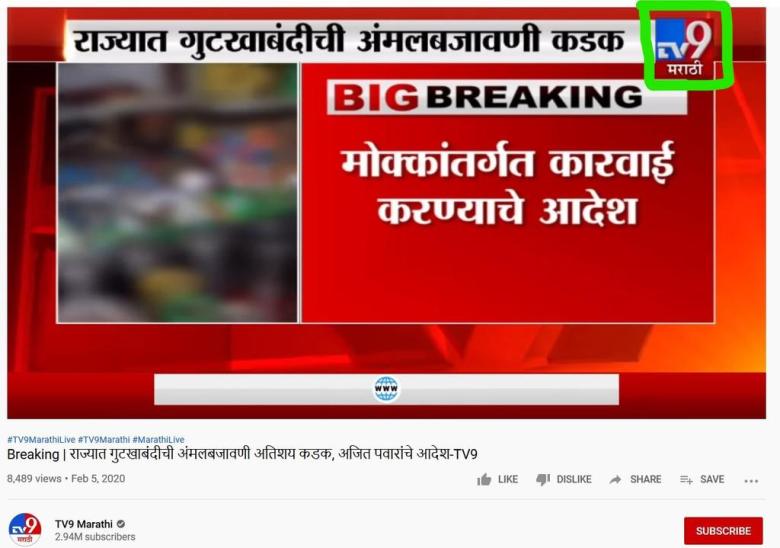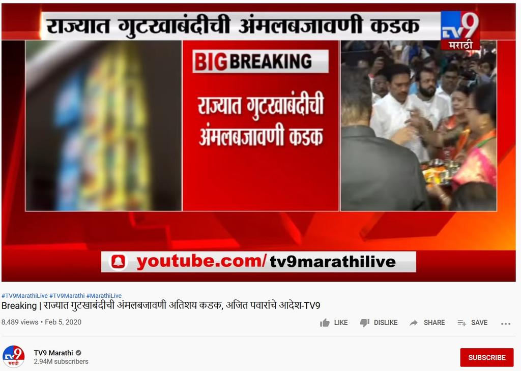 DigitEye India looked up TV9’s YouTube channel to find more background information on this news package. We found no news regarding corona virus having been found in gutkha samples on their channel. However, they do have a news package on similar lines- “Breaking | राज्यात गुटखाबंदीची अंमलबजावणी अतिशय कडक, अजित पवारांचे आदेश-TV9” [Translation: After Ajit Pawar’s order, strict measures have been take to enforce the gutkha ban]. This was posted on February 5, 2020.