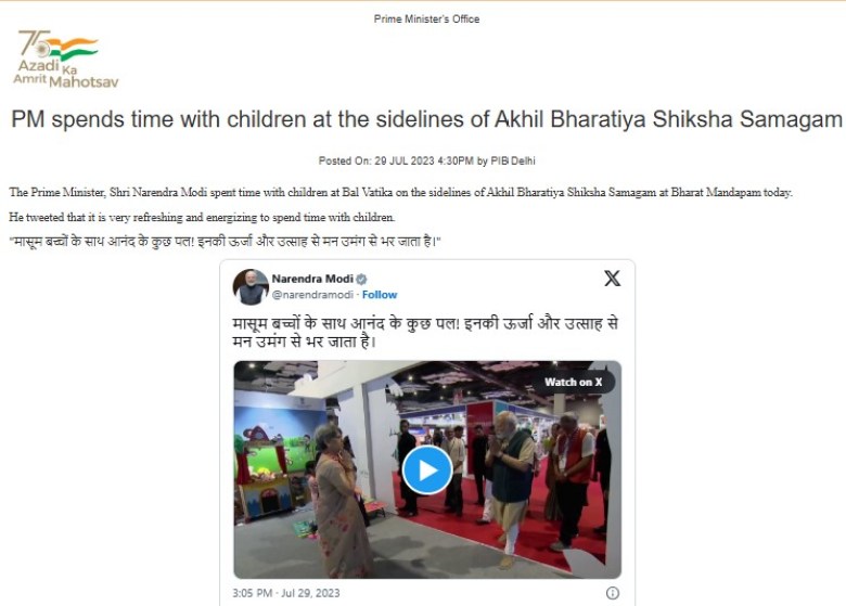 The press release also captured a post by the Prime Minister on his official X post (then Twitter). The post made on 29 July 2023 is captioned: “मासूम बच्चों के साथ आनंद के कुछ पल! इनकी ऊर्जा और उत्साह से मन उमंग से भर जाता है।”In English this reads : “Some joyful moments with innocent children! Their energy and enthusiasm fill the heart with excitement.”