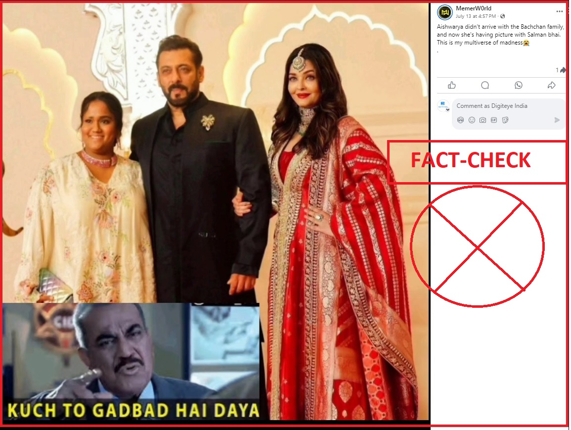 A photo of Aishwarya Rai Bachchan posing with Salman Khan is going viral on social media on the sidelines of the Ambani wedding festivities which stormed Internet over the past few months. The photo shows Aishwarya Rai posing with Salman Khan and his sister Arpita Khan with a claim that reads: “Aishwarya didn’t arrive with the Bachchan family, and now she’s having picture with Salman bhai. This is my multiverse of madness.”