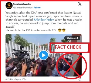 The claim reads, “Yesterday, after the DNA test confirmed that leader Nabab Singh Yadav had raped a minor girl, reporters from various channels surrounded #AkhileshYadav When he was unable to answer, he was forced to jump from the gate and run away!! He wants to be PM in rotation with RG.” It was posted on Sept. 9, 2024. The claim can be accessed here and here.