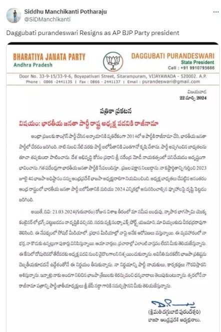 Subject: Resignation of Bharatiya Janata Party State PresidentDue to the injustice made to Andhra people in 2014 by the Congress Party, resigned from it and joined the Bharatiya Janata Party. I have worked hard to strengthen the party (BJP) since then. I discharged all the responsibilities assigned by the party. I felt fortunate to work under the leadership of Prime Minister Shri Narendra Modi for the development of the country. I have been serving the Bharatiya Janata Party for the past ten years. I have stood on the side of the people. In recognition of my hard work, on July 4, 2023, the BJP leadership appointed me as the president of Andhra Pradesh BJP. After taking charge of the presidency, the focus was on the strengthening the Bharatiya Janata Party in Andhra state and the strategies to be followed in the 2024 elections. However, on 21.03.2024 (Thursday), it came to my notice that drugs were seized in a container shipped to one of our close relatives and business partner at Visakhapatnam. The person is known to be the owner of Sandhya Exports, our brother-in-law Veerabhadra Rao. In this background, many accusations are being made against me on social media and mainstream media. There are rumours that my husband and my son are involved in this affair. I inform you that there is no truth in the news and propaganda. Until the the guilty is found in this case, I decided to step down from the post of state president. I have taken this decision with the intention not to tarnish the reputation of the BJP. I hope the party leaders and workers will respect my decision. I would like to thank the BJP ranks who have supported me all these years. I will soon submit my resignation letter to the party president Shri JP Nadda.”