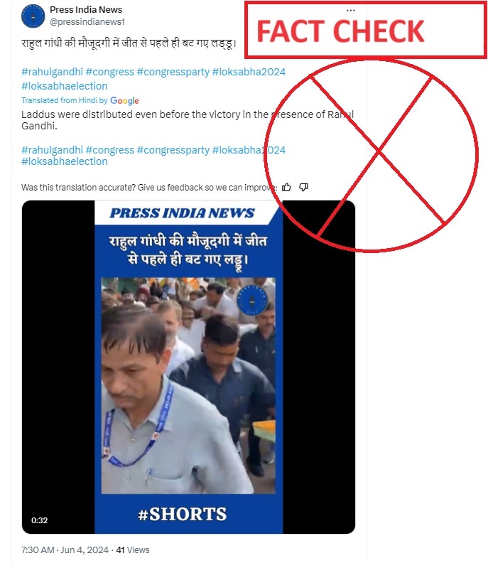 The claim stated, “कांग्रेस कार्यालय में राहुल गांधी की मौजूदगी में आज ही लड्डू बट गए हैं, कल अंध भक्तों रोना मत, क्योंकि कल से तुम्हारे बुरे दिन शुरू होने वाले हैं। 🤣भक्तों पापा के साथ कल झोला उठाना है तुम्हें। ” [Translated, it reads:’Laddus were distributed even before the victory in the presence of Rahul Gandhi’.]