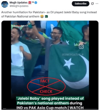 The claim suggested a humorous blunder that embarrassed the Pakistani team just before the anthems. Another verified X user ‘MeghUpdates’ also posted a similar claim with the caption “Another humiliation for Pakistan- as DJ played Jalebi Baby song instead of Pakistan National anthem” View the post here: