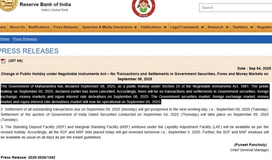 The RBI had declared 5th September as a holiday initially but had cancelled it. A report published by the Economic Times captures this and writes that the RBI said “The Government of Maharashtra has declared September 08, 2025, as a public holiday under Section 25 of the Negotiable Instruments Act, 1881. The public holiday on September 05, 2025, declared earlier has been cancelled.”