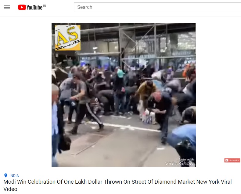 The description to the video says, “Hi, I am Kapil Thakur welcome to our YouTube channel As News and Viral videos. This video we are showing u #modiwin celebration of #onelakhdollar thrown on street of #diamondmarket#newyorkIt showed that Modi’s return has resonated in New York and an Indian millionaire in Diamond Market has celebrated the victory by throwing dollar notes in the air from the building.”