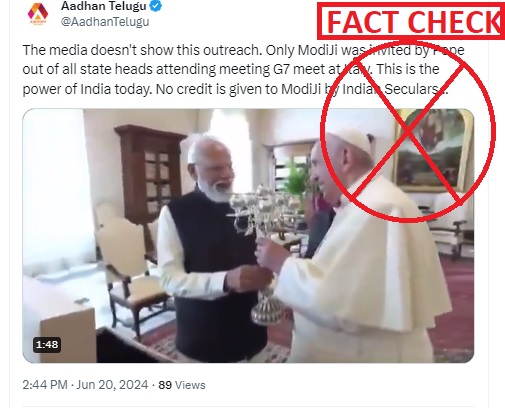 Hence, the claim that the video shows meeting between Modi and Pope Francis at the G7 meeting held recently was false. No such special invitation was extended only to Modi at the G7 meeting.