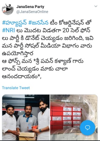 The statement in Telugu reads: “In coordination with Houston-based team of Janasena, 20 mobile phones have been donated to the party in the first phase. These phones will be used by our Social Media team. We are glad that our Pawan Kalyan (party chief) has launched these phones.”