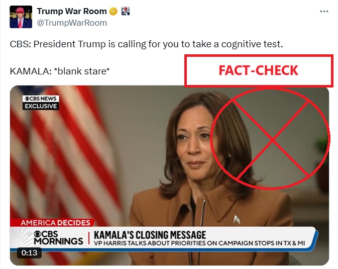 The video shows Harris staring at the interviewer and the claim reads:” CBS: President Trump is calling for you to take a cognitive test. KAMALA: *blank stare* — Trump War Room.” It has been widely shared on social media and can be accessed here and here.