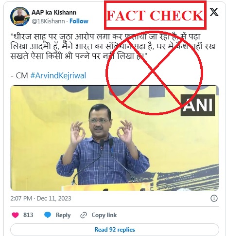 The claim said Kejriwal made a statement that said: “Dheeraj Sahu is being framed with false allegations. I am an educated man, I have read the Constitution of India and it is not written on any page that one cannot keep cash at home.”