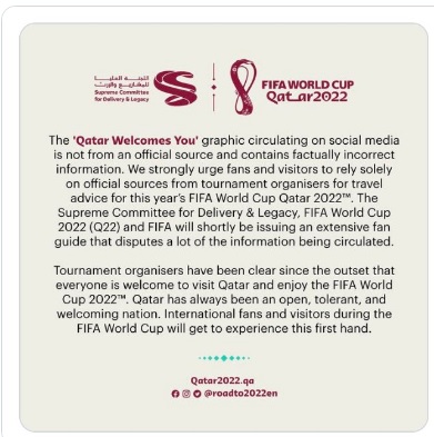 Above tweet, dated October 6, 2022, published on @Roadto2022en — the Official account for Qatar’s FIFA World Cup 2022, clarifies that the viral image has not been issued by the authorities and contains factually incorrect information.