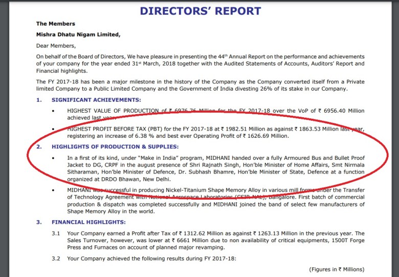 The tweet read:“Armored Bus and Bhabha Kavach, lightweight BP jacket manufactured under #MakeInIndia by MIDHANI handed over to DG CRPF today.” Further, MIDHANI Limited in its annual report 2017-18, confirmed this as shown below: