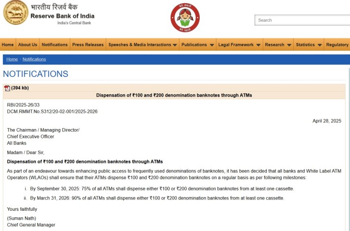 “As part of an endeavour towards enhancing public access to frequently used denominations of banknotes, it has been decided that all banks and White Label ATM Operators (WLAOs) shall ensure that their ATMs dispense Rs 100 and Rs 200 denomination banknotes on a regular basis…,” the Reserve Bank of India (RBI) said in its circular.