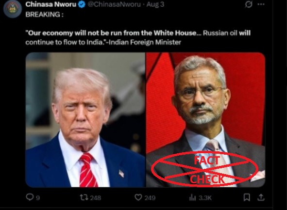 Several users posted pictures of S Jaishankar and this comment : “Our economy will not be run from the White House…Russian oil will continue to flow to India”. They attributed this comment to him, portraying it as an official statement by the Ministry of External Affairs.
