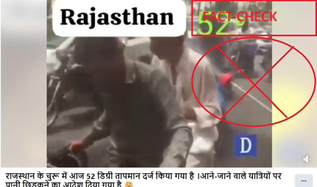 The video was shared with a caption in Hindi that reads, ‘राजस्थान के चुरू में आज 52 डिग्री तापमान दर्ज किया गया है ।आने-जाने वाले यात्रियों पर पानी छिड़कने का आदेश दिया गया है’[Translated into English: In Churu, Rajasthan, today’s temperature has been recorded at 52 degrees Celsius. Orders have been given to sprinkle water on incoming and outgoing passengers.]