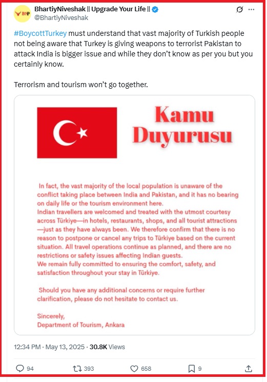 It was shared online amid growing calls in Indian social media to boycott Turkey by cancelling travel to the country due to its vocal support for Pakistan during recent India-Pakistan conflict.