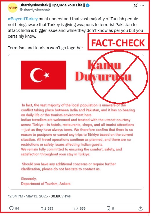 Further scrutiny of the Ministry’s official website and its recent press releases yielded no such statement directed at Indian tourists. Neither local Turkish media nor international news outlets reported any official communication resembling the viral circular, let alone acknowledging the boycott. Moreover, the text in the circular does not resemble an official document or announcement.