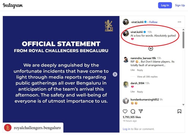The video suggests that Virat Kohli and his team are seen leaving Bengaluru for London with no remorse on deaths which occurred in the tragic stampede. When the Digiteye India team searched the social media further, it found that the video shows Virat Kohli when he returned to Mumbai and not from Bengaluru airport as claimed. Soon after the stampede, Virat Kohli released a statement on Instagram regretting the tragedy as seen below: