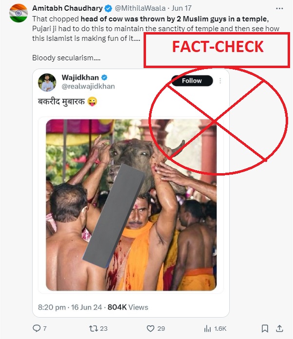 A screenshot on X showing a priest carrying a severed buffalo head on his head inside a temple is being shared with a claim that a Hindu priest is carrying it following recent communal tensions in Ratlam, Madhya Pradesh where some persons were arrested for throwing cow parts into a temple on Friday, June 14, 2024.