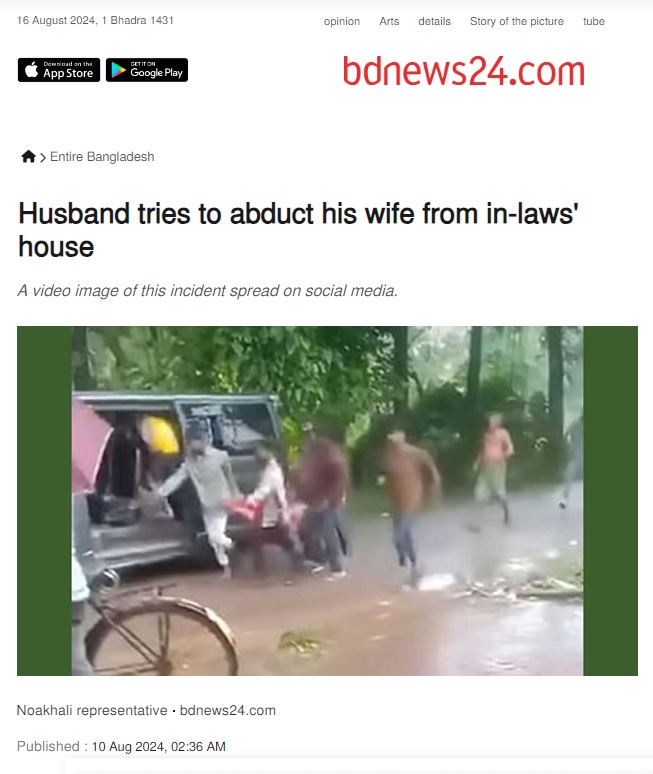 The news report detailed that a man abducted his wife on August 8, 2024, in the Senbagh area of the Noakhali district of Bangladesh. He was identified as Prasenjit, who came with his supporters in two small buses. When he was taking his wife n a vehicle, her screams attrated passersby who apprehended him.