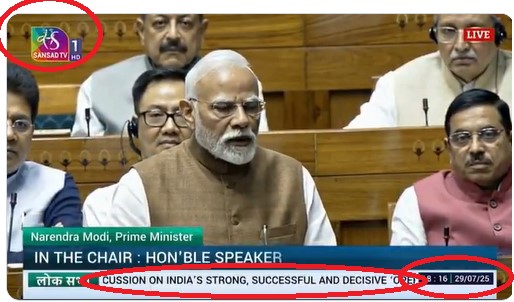 A viral footage is being circulated around various social media platforms, claiming that PM Modi was scared after the Phalagam attack. The video showcases PM Modi speaking in the parliament and the Sansad TV logo dated 29/7/25 from 18:15 to 18:17 can be seen.