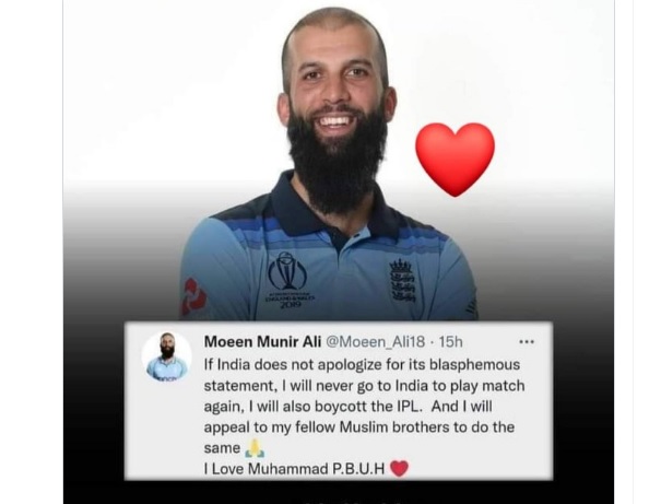 The viral tweet using the handle “@Moeen_Ali18” said: “If India does not apologize for its blasphemous statement, I will never go to India to play match again, I will also boycott the IPL. And I will appeal to my fellow Muslim brothers to do the same… I Love Muhammad P.B.U.H”