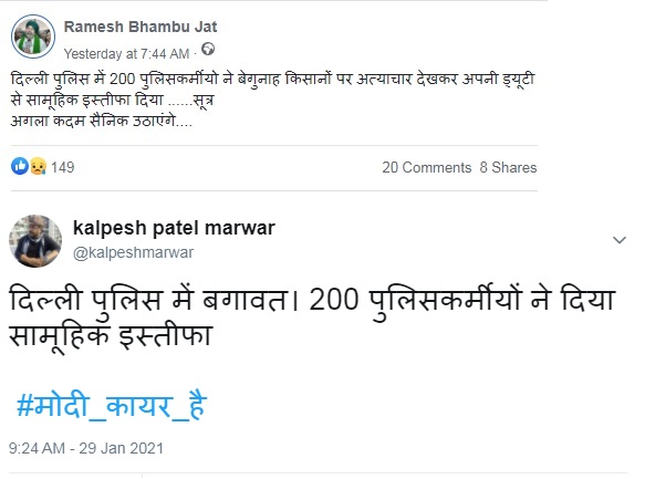A message on Twitter and Facebook started claiming on Saturday, Jan 30, 2021 that 200 policemen in Delhi have tendered mass resignation in support of protesting farmers, soon after the reported clashes between farmers and police on Republic Day.