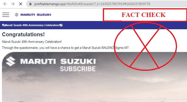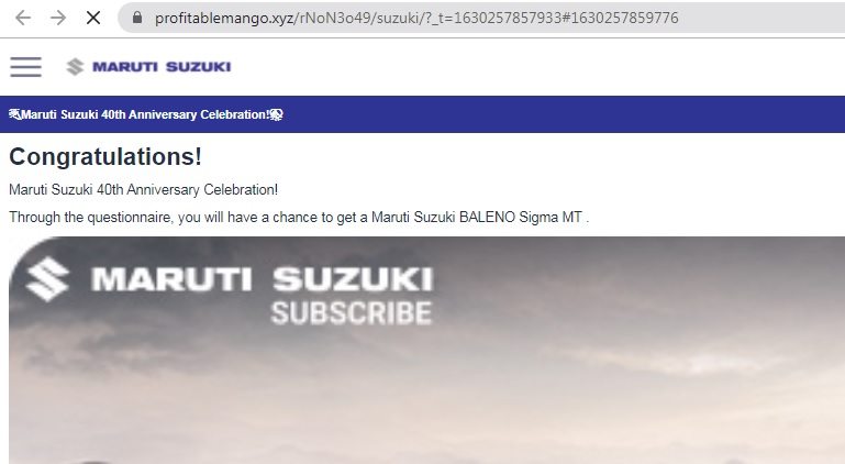 DigitEye India received a similar message with a link to a clickbait site https://profitablemango.xyz/rNoN3o49/suzuki/?_t=1630257857933#1630257859776 which claimed to be an offer from the Maruti Suzuki. It reads: