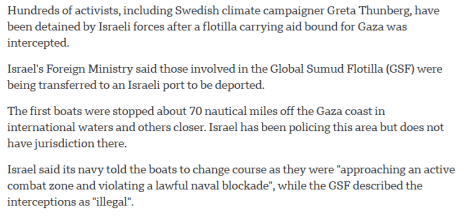 On 2nd October, 2025 Israeli naval forces intercepted vessels from the Global Sumud Flotilla in the Mediterranean, detaining hundreds of activists, including Thunberg. The flotilla, comprising around 40 boats and 500 participants, aimed to deliver aid to Gaza amid ongoing conflict. Thunberg, aboard one ship, was transferred to Israel for deportation proceedings. View a report by the BBC on this incident –