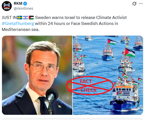 Recently several social media users have shared claims of Sweden warning Israel over the detention of Greta Thunberg. Verified X user ‘rkmtimes’ shared such a post on October 2, 2025, claiming that Sweden has officially warned Israel to release climate activist Greta Thunberg within 24 hours or face “Swedish actions” in the Mediterranean Sea.