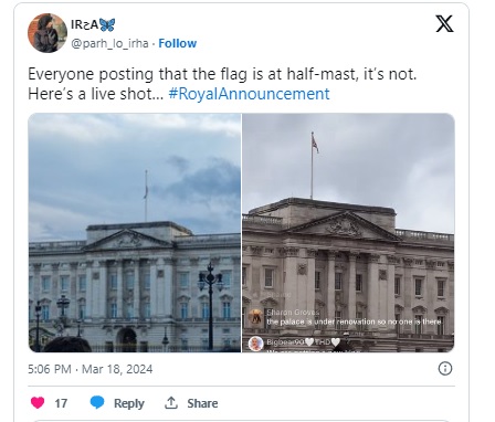 First of all, the flag at Buckingham Palace is NOT at half-mast. A video to this effect is widely circulating on Twitter and the alleged image next to it was from September 2022 when Queen Elizabeth II passed away. Hence, no truth in this claim.