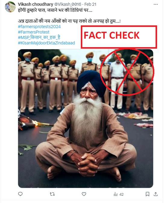 Claim: Image of moist-eyed farmer sitting in protest on a road surrounded by policemen with #Farmersprotest2024