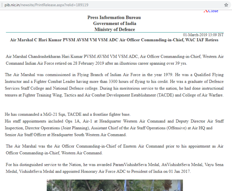 When searched further on Twitter, the message put out by the Ministry of Defence stated clearly the Air Marshal actually retired. His last working day was Thursday, February 28, and he was given a warm ceremonial send off by the command. Further research by Digiteye India team led us to get the following PIB press release, which is usually given out everytime a high official retires from his office. See it below: