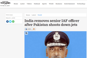 Amid border tension over the capture of Indian Air Force pilot Abhinandan Varthaman by Pakistan, a news story on website The News said that the Indian government has removed a senior air force officer reportedly after Pakistan’s “successful strikes and capturing of a pilot” on February 27. See the screengrab here: