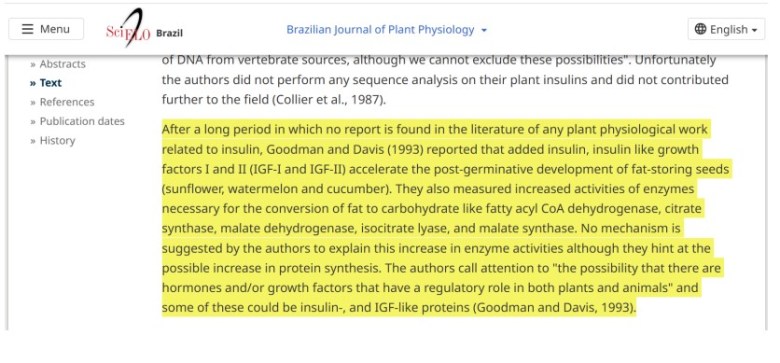 Another research article published by the Brazilian Journal of Plant Physiology in 2003 affirms the insulin‑like proteins exist in plants, their exact physiological roles remain unclear and controversial.