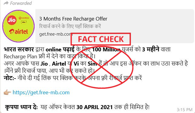 Translation: “The Indian Government has promised to give three month data recharge plan for free to 100 million users for online education. You can only avail the benefits if you have a Jio, Airtel or Vi sim. I have received my free recharge, you can do so too. Click on the link ?? https://get.free-mb.com to receive the free recharge. Please note: Offer is valid only till 30th April 2021.”
