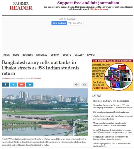 Secondly, we checked some key frames of the video showing Army trucks moving on a road. A lake and some high-rise buildings are visible in the image which were checked on Google Reverse Image Search. The results show that in the background is Shaheed Squadron Leader Rizwan Lake near Tejgaon Airport in Dhaka, which is a Bangladesh Air Force base. The picture was used by Kashmir Reader on July 21, 2024 while reporting the return of Indian students from riot-hit Bangladesh. It clearly states that the Bangladesh army is moving its tanks on Dhaka streets, not Indian tanks.