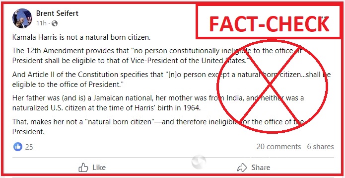 Conclusion: The claim is false. Kamala Harris is a “natural born citizen” of the United States and hence, eligile to be US Presidential candidate.
