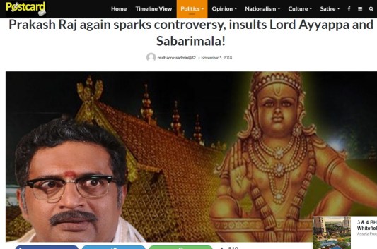Recently, Post Card News, a news portal known for allegedly having lenience towards right-wing too claimed that Prakash Raj’s original name is Prakash Edward Rai. In their story, they alleged that Prakash Raj is closely working with Christian missionaries to malign Hindus in the nation.