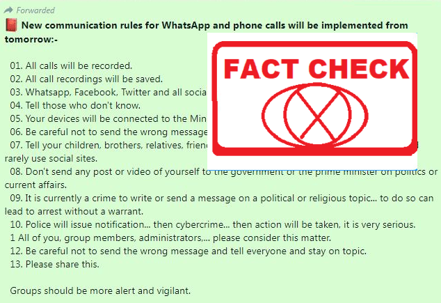 In the message, it is claimed that calls will be recorded. It urged people to refrain from commenting on political or religious issues on social media. The message reads, “All recordings will be saved. WhatsApp, Facebook, Twitter and all social media will be monitored. Your devices will be connected to the Ministry system. Be careful not to send the wrong message to anyone.”
